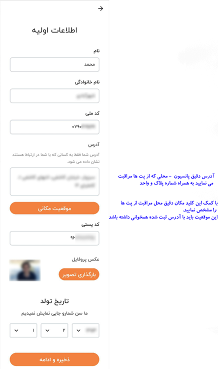 - اطلاعات اولیه( نام- نام خانوادگی- کد ملی- آدرس دقیق پانسیون خانگی شما- لوکیشن دقیق پانسیون خانگی شما- کد پستی پانسیون خانگی شما- بار گذاری تصویر از خودتان به عنوان سیتر- تعیین تاریخ تولد)