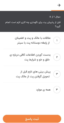 - پاسخ دادن به سوالات( برای سیتر شدن باید اطلاعات مناسبی درباره ی پت داشته باشید و به سوالات این بخش پاسخ درستی بدهید.)